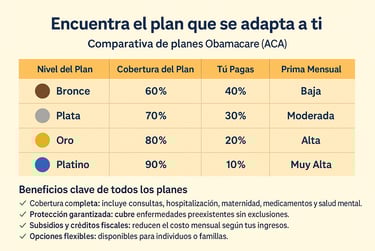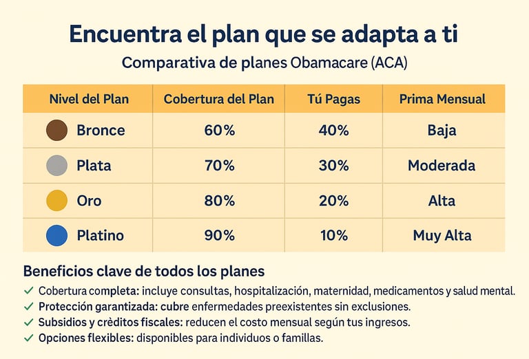 OBAMACARE ofrece (4) tipos principales de Planes de Salud, llamados “niveles metálicos”, que varían según cuánto pagas tú y cuánto cubre el seguro: